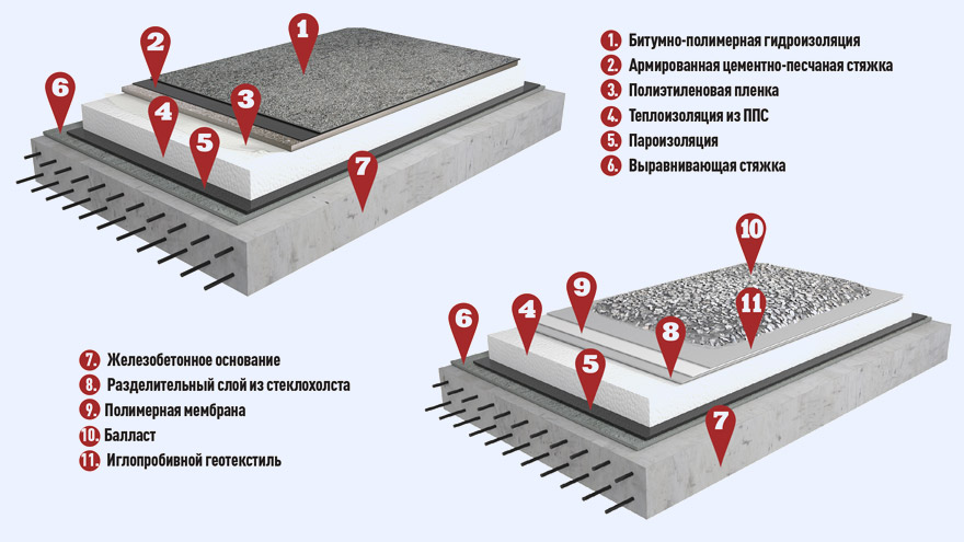 Разработан шаблон спецификации в соответствии с ГОСТ Р 21.1101-2013. Крыша с несущими железобетонными плитами с теплоизоляцией из пенополистирольных плит ППС30-Т, выравнивающей затиркой из цементно-песчаного раствора, пароизоляцией и водоизоляционным ковром. Уклонообразующий слой выполняется из цементно-песчаного раствора. Применяется в многоэтажном строительстве.